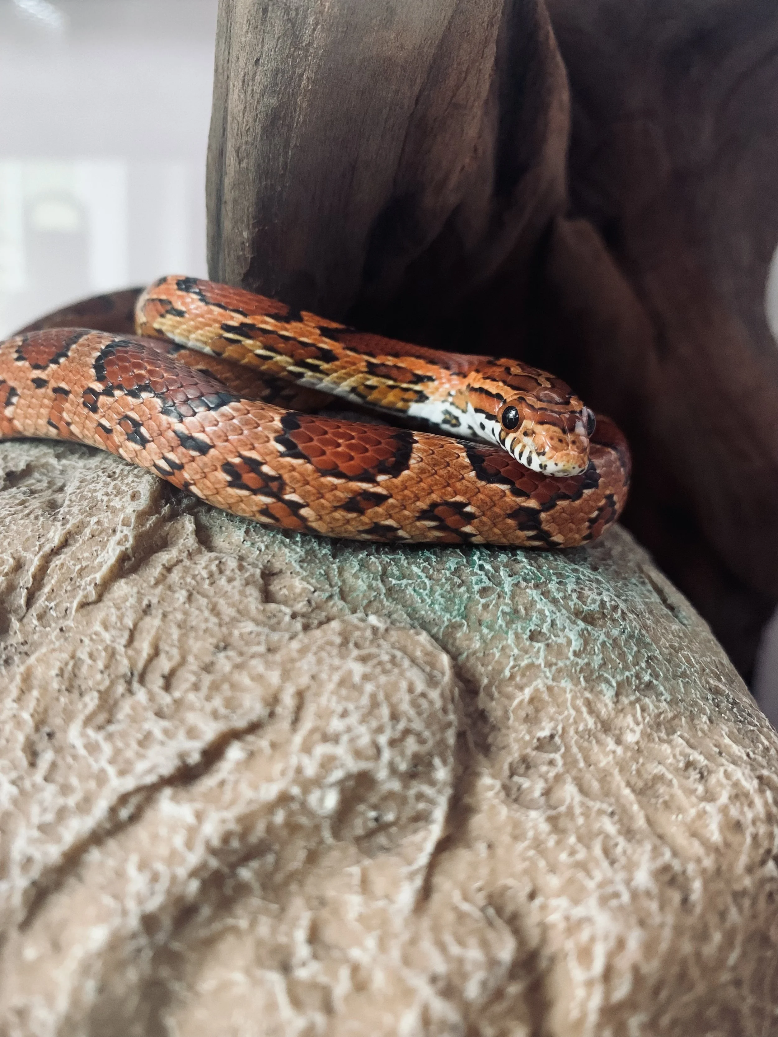 This is Noodle, a corn snake. He’s super friendly and loves to be held. Noodle loves to climb around his home, but he’s a bit of a klutz (sometimes you'll hear him fall into his water dish).